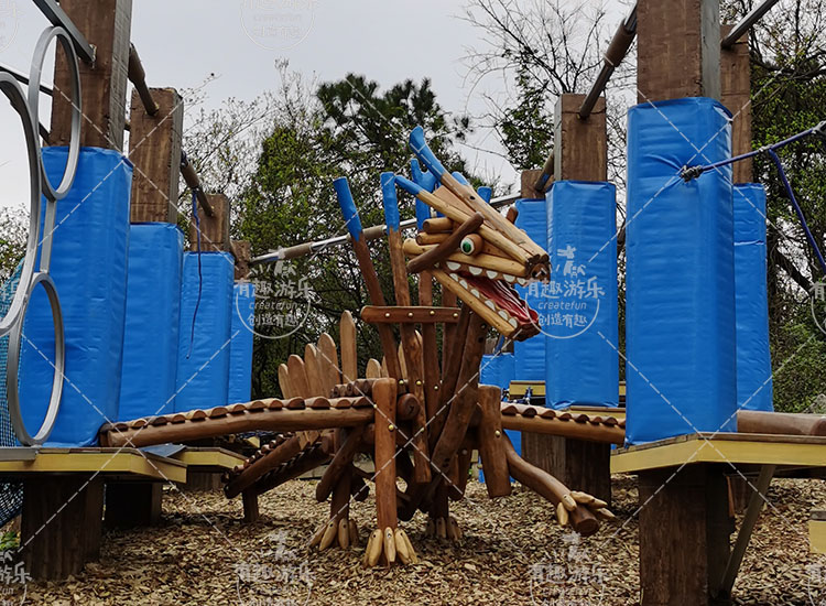翼龍樂(lè)園區(qū)是利用客戶場(chǎng)地上原有的立柱,充分將廢棄的場(chǎng)地再度利用,讓已經(jīng)荒廢的場(chǎng)地重裝上陣,成為一個(gè)為用戶帶來(lái)快樂(lè)的新場(chǎng)地,我們?cè)陉惻f的立柱與立柱之間設(shè)計(jì)了各種造型的趣橋項(xiàng)目,同時(shí)打造生動(dòng)好玩的翼龍攀爬作為連接橋,讓我們的項(xiàng)目好玩又好看。