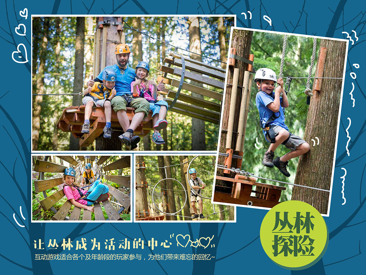叢林探險(xiǎn)(樹上探險(xiǎn))項(xiàng)目是在大樹之間設(shè)置的運(yùn)動(dòng)繩索、軟橋或繩網(wǎng)等有挑戰(zhàn)的項(xiàng)目,使人們?cè)诶K網(wǎng)上搖擺和嬉戲,或者通過從一棵樹到另一棵樹上擺動(dòng)的吊橋。